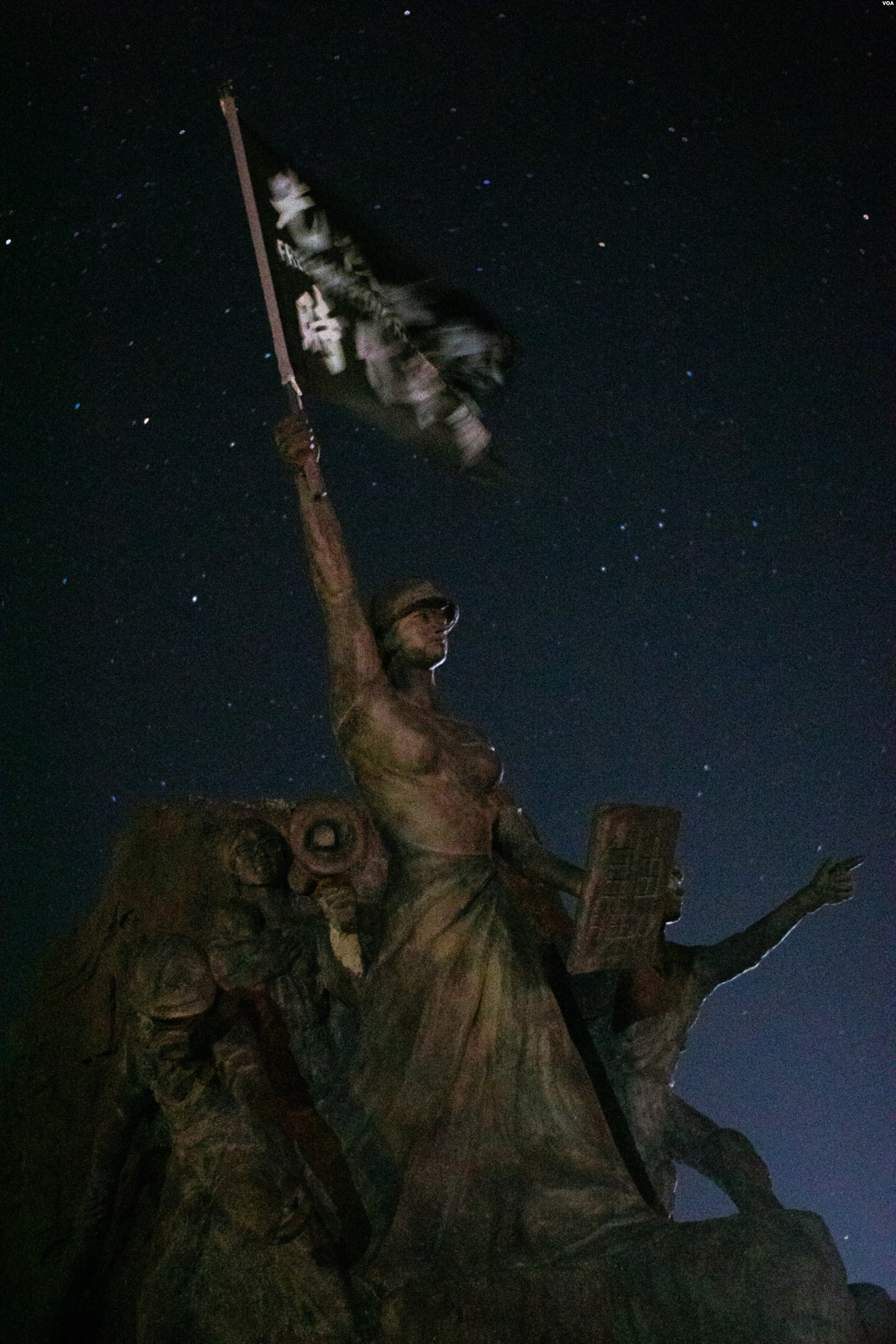 他通过遥控无人机搭载的灯光从雕塑上方提供照明,陈维明和义工、雕塑家苏立德站在雕塑前,他们在Jonas的调度下不断调整位置,两人一红一蓝的衬衣在黑色的夜幕下格外鲜艳。在无人机投射的微弱白光下,夜色中由习近平形象和骷髅组成的雕塑面部显得阴冷无情。