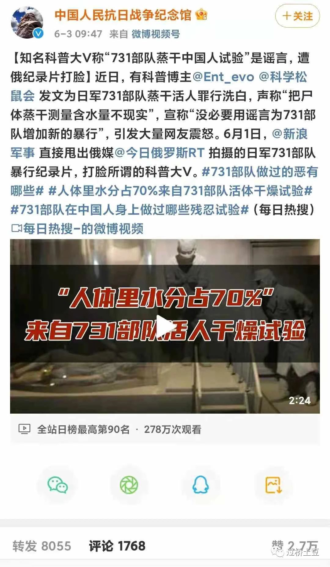 6月3日,中国人民抗日战争纪念馆 官博贴出科普大V为731部队“洗地”事件的前因后果,以及关于731部队的记录片,并将贴文置顶。称该大V被俄纪录片打脸。