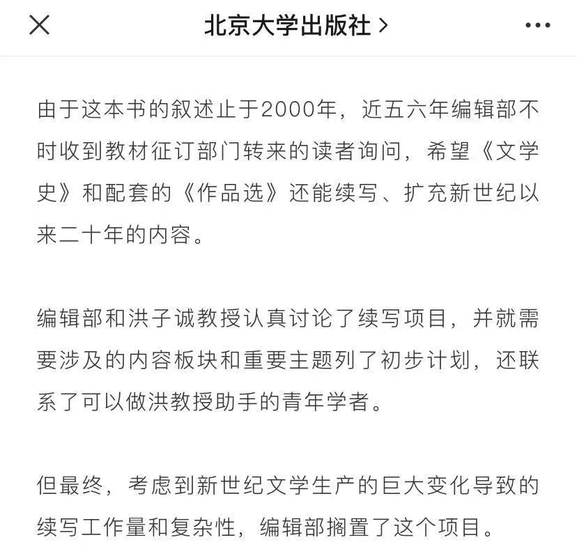 就在被指“问题教材”的第二天,北京大学出版社官方微信透露了《中国当代文学史》再版搁置及故事续写计划,其中提到:我们计划制作《中国当代文学史》的“纪念版”,收入相关的其他材料,帮助读者全面、深入理解这一作品。我们期待这本“纪念版”早日问世,到时只需稍加对比,我们就能知道周作人是否真的不能提了。