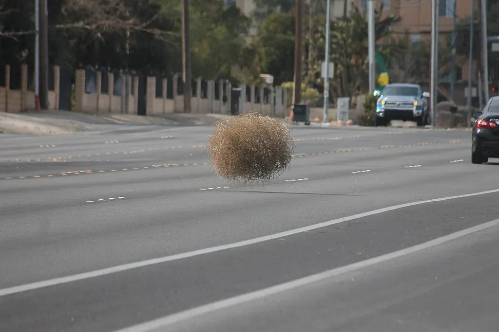 正在“赌城”拉斯韦加斯街道上翻滚的干枯刺沙蓬植株(Noah Wulf@Wikimedia, CC BY-SA 4.0)