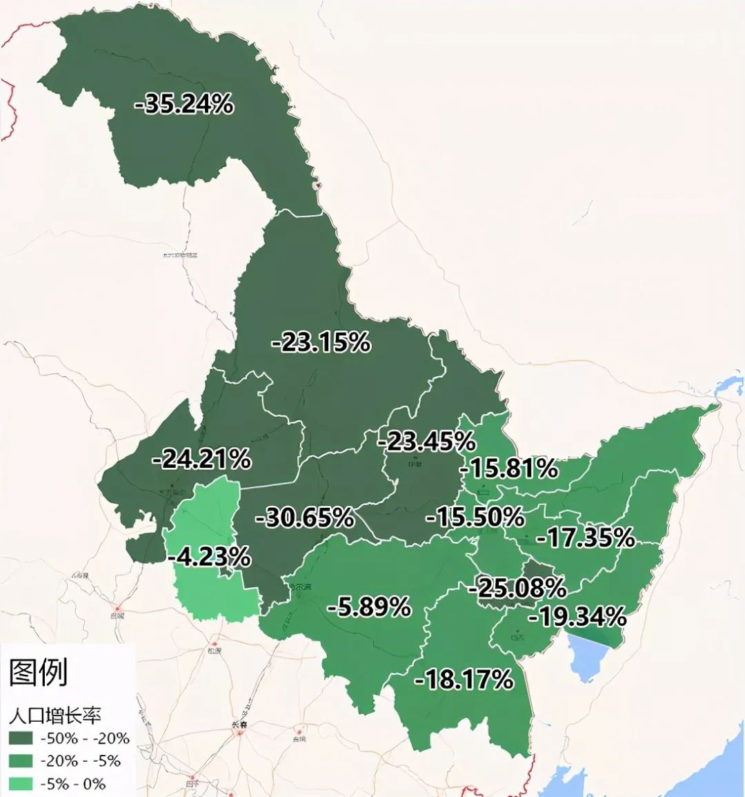 这种落差与变化,本地人当然最有感触,也早就在默默地用脚投票了。根据第七次人口普查数据,黑龙江是2010-2020这十年间人口流失最严重的省份,共减少了646万人,下降了16.87%,除了吉林之外,另外四个省份即便人口负增长,也都没超过5%的幅度。不仅如此,黑龙江还是全国唯一一个所有地市都出现负增长的省份,连省会哈尔滨都不例外——事实上,哈尔滨也是这十年里唯一人口负增长的省会城市。