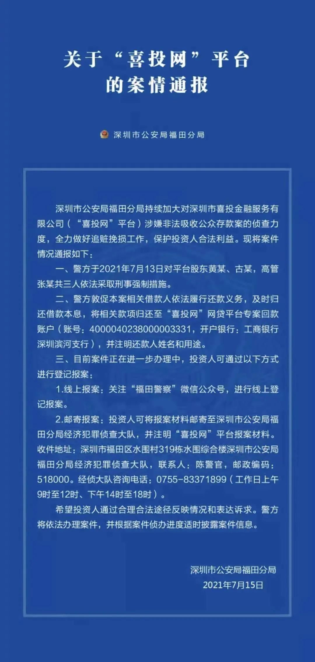 深圳公安局福田分局昨日发布《关于“喜投网”平台的案情通报》,全文如下: