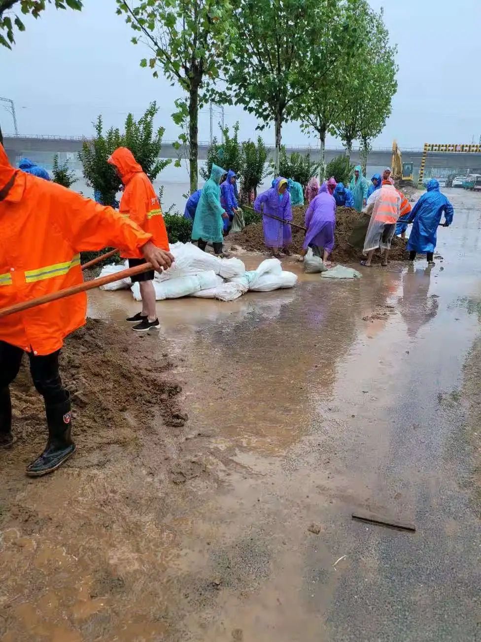 7月20日晚上,留在村里的,除了干部之外,还有一批年轻人,他们正好赶上学校放暑假,可以帮忙干点活儿。大家穿着不同颜色的雨衣,忙着用铁锹往水泥袋里装泥土,再把泥袋子扛到堤坝边上。