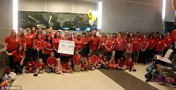 7月20日晚上,Brent、Audrey Shook和五个孩子等待在机场门口,当Lucy出现在机场出口处时,