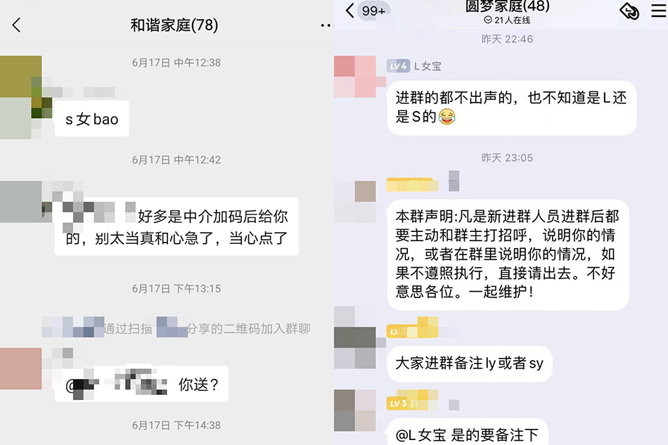 “S”,是行内黑话,表示 “ 送”,与之对应的“L”,则意味着“领 ”。这两个英语字母,对应两种身份,隔三差五就会在群里闪烁。上官正义介绍,这个婴儿贩卖团伙经营的微信群,约100人上下,因涉及到敏感词汇,每个月都会通知组建新群,但群里基本上是同一拨人,来自全国多个省市。新成员一进群,就被要求标注自己的需求,若不遵守执行,就会被直接请出去。