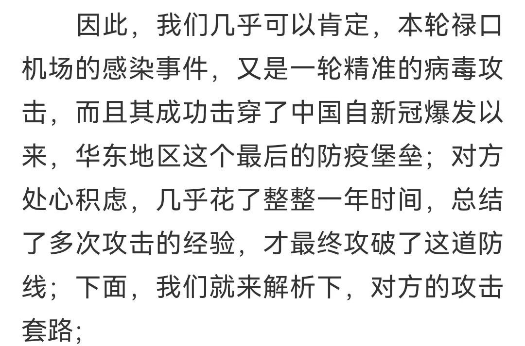 “本轮禄口机场的感染事件,又是一轮精准的病毒攻击,而且其成功击穿了中国自新冠爆发以来,华东地区这个最后的防疫堡垒;对方处心积虑,几乎花了整整一年时间,总结了多次攻击的经验,才最终攻破了这道防线……”