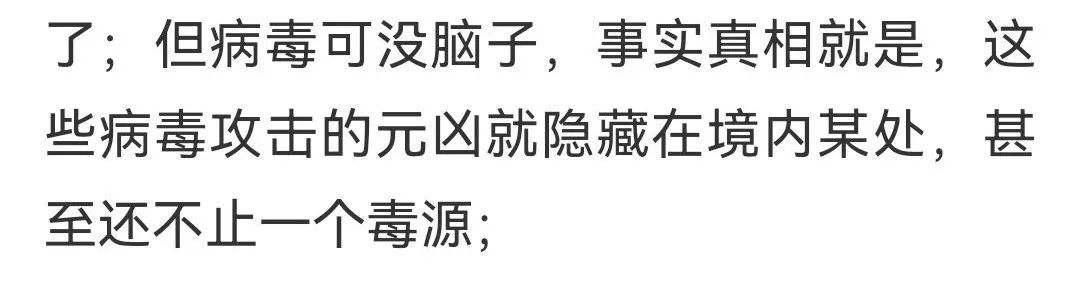 本来以为司马南说的“对方”是指俄方呢,看到最后才发现,他竟然认为“这些病毒攻击的元凶就隐藏在境内某处,甚至还不止一个毒源”。那么,谁是CA910航班病毒的接应者呢?叼盘懦夫斯基还是冯军?细思恐极。“安内”还包括查出境内的毒源隐藏者和内应者吧。
