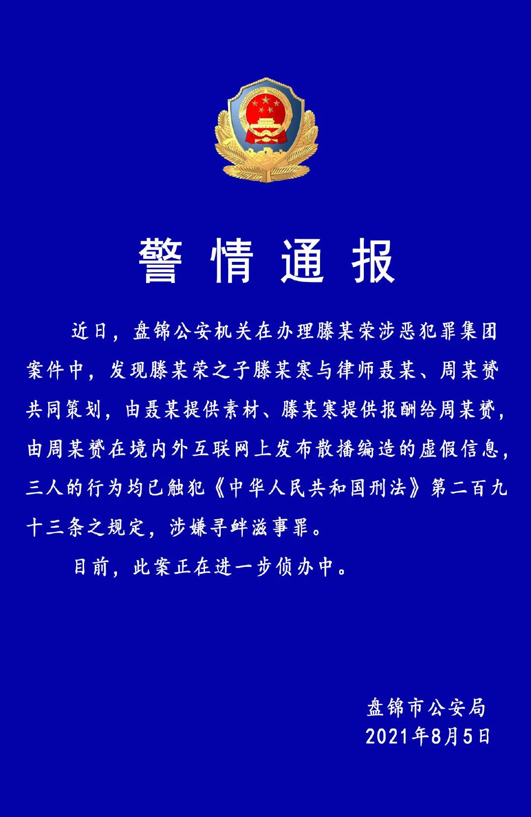 这事引起了舆论强烈而广泛的关注。8月5日晚10点,盘锦市公安局终于发布了通报,称周筱赟在互联网上发布散播虚假信息,涉嫌寻衅滋事。