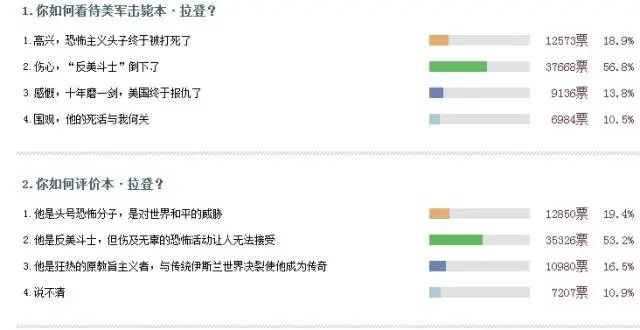 让我们从大数据入手。根据凤凰网当时的一份民调显示,在“你如何看待美军击毙本·拉登”这个问题中,有56.8%的人民群众表达了自己的伤心之情;同样,还有53.2%的人民群众给予了本·拉登至高无上的正面评价:“反美斗士”。