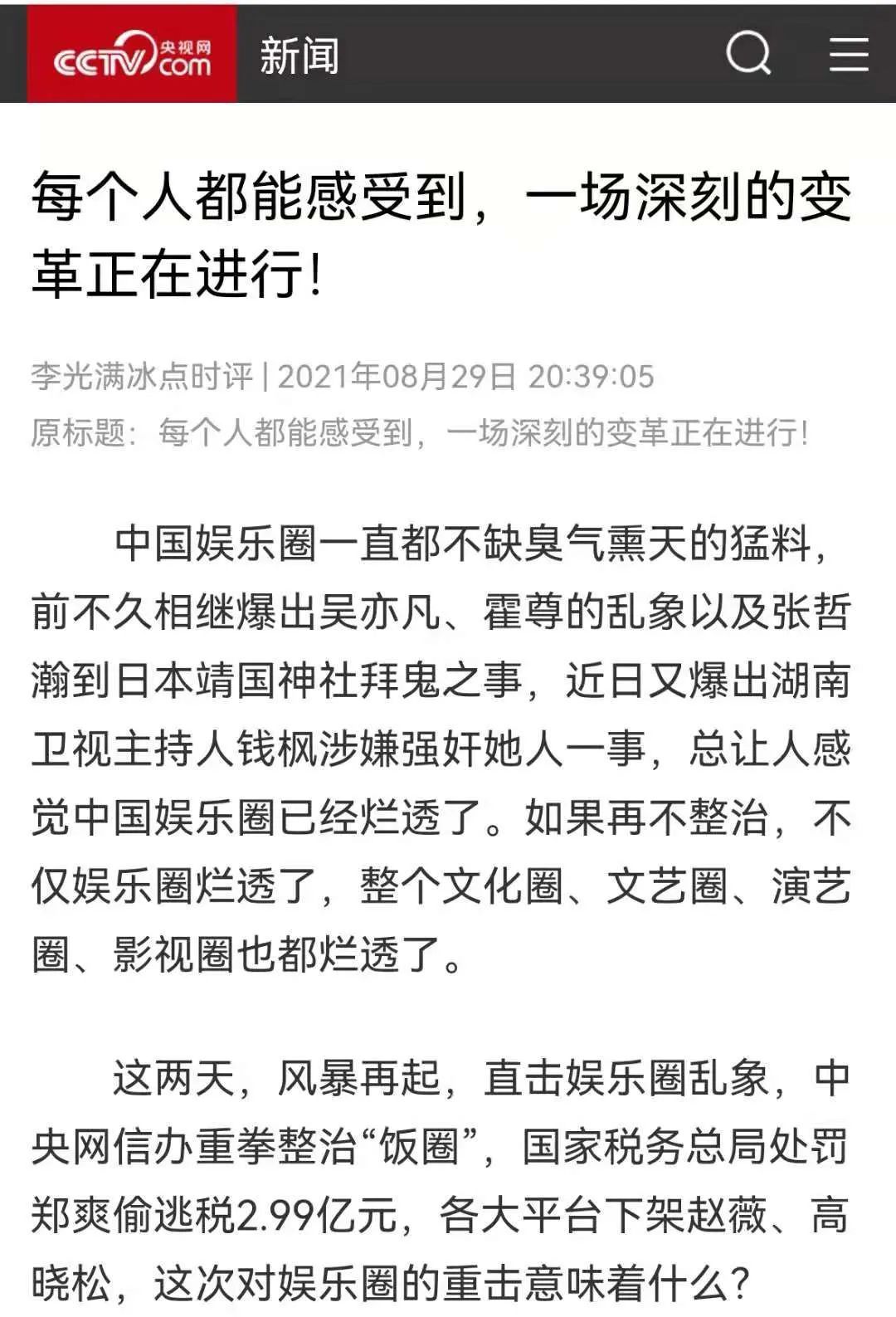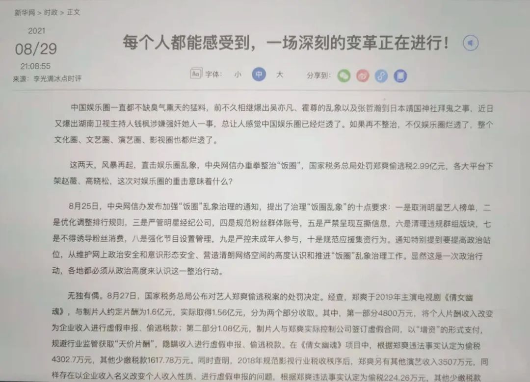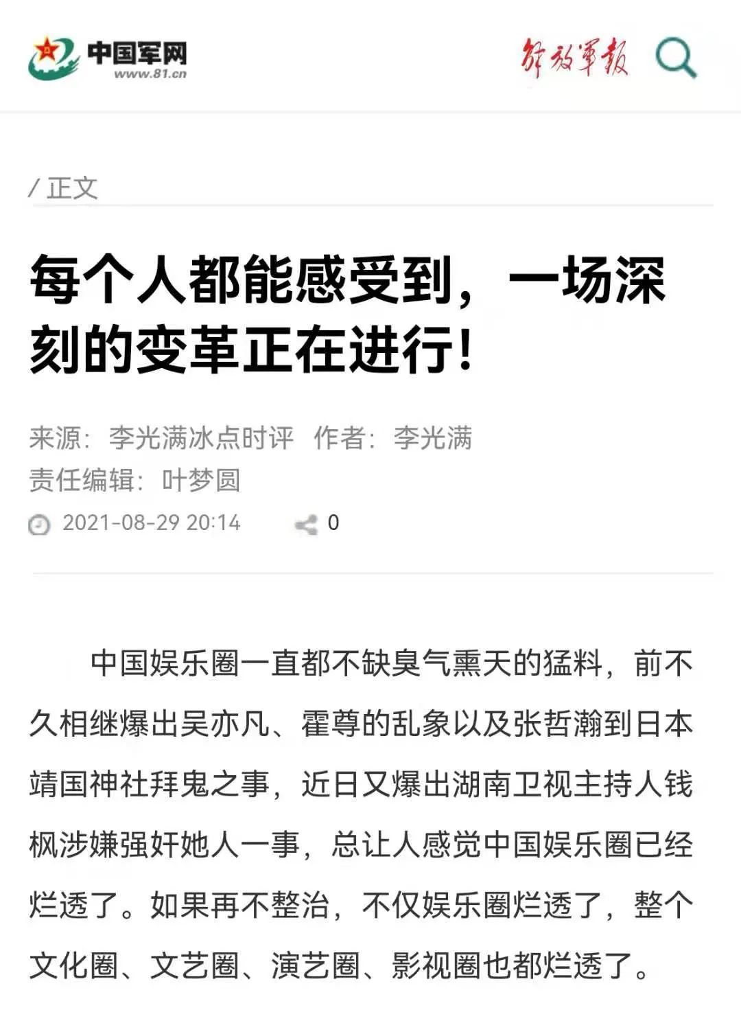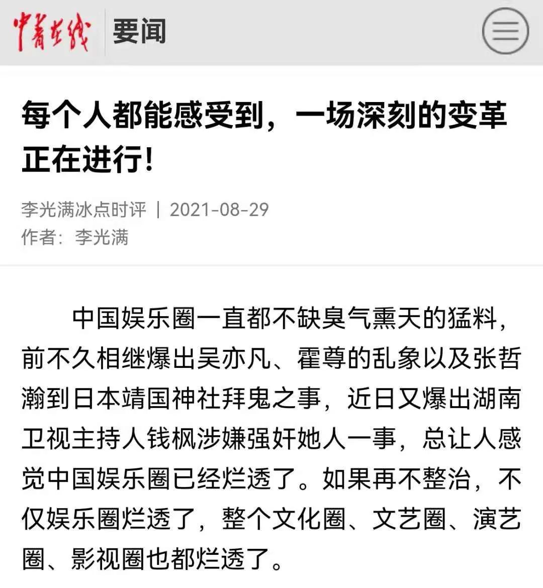 编者按:8月29日,包括新华网、人民网、央视网、光明网、中新网在内的多家官媒在头版重要位置转发了一篇名为《每个人都能感受到,一场深刻的变革正在进行!》的文章,该文来自微信公众号“李光满冰点时评”,内容为围绕中央网信办加强饭圈乱象重拳治理的行动点评“娱乐圈乱象”,其作者李光满认为“当前中国正在发生的这场深刻变革…..是为了应对美国已经开始对中国发动的野蛮而凶猛的攻击”,建议彻底整肃“资本圈、娱乐圈、文艺圈、影视圈”,希望变革“向着中国共产党的初心回归”。数十家官媒集中统一刊发来自公众号的文章——此举较为罕见,以至于作者李光满专门撰文记录这一重大时刻,并自称“这显然是新闻宣传主管部门和网信主管部门的统一安排,由此形成了非常强势的宣传效应。”