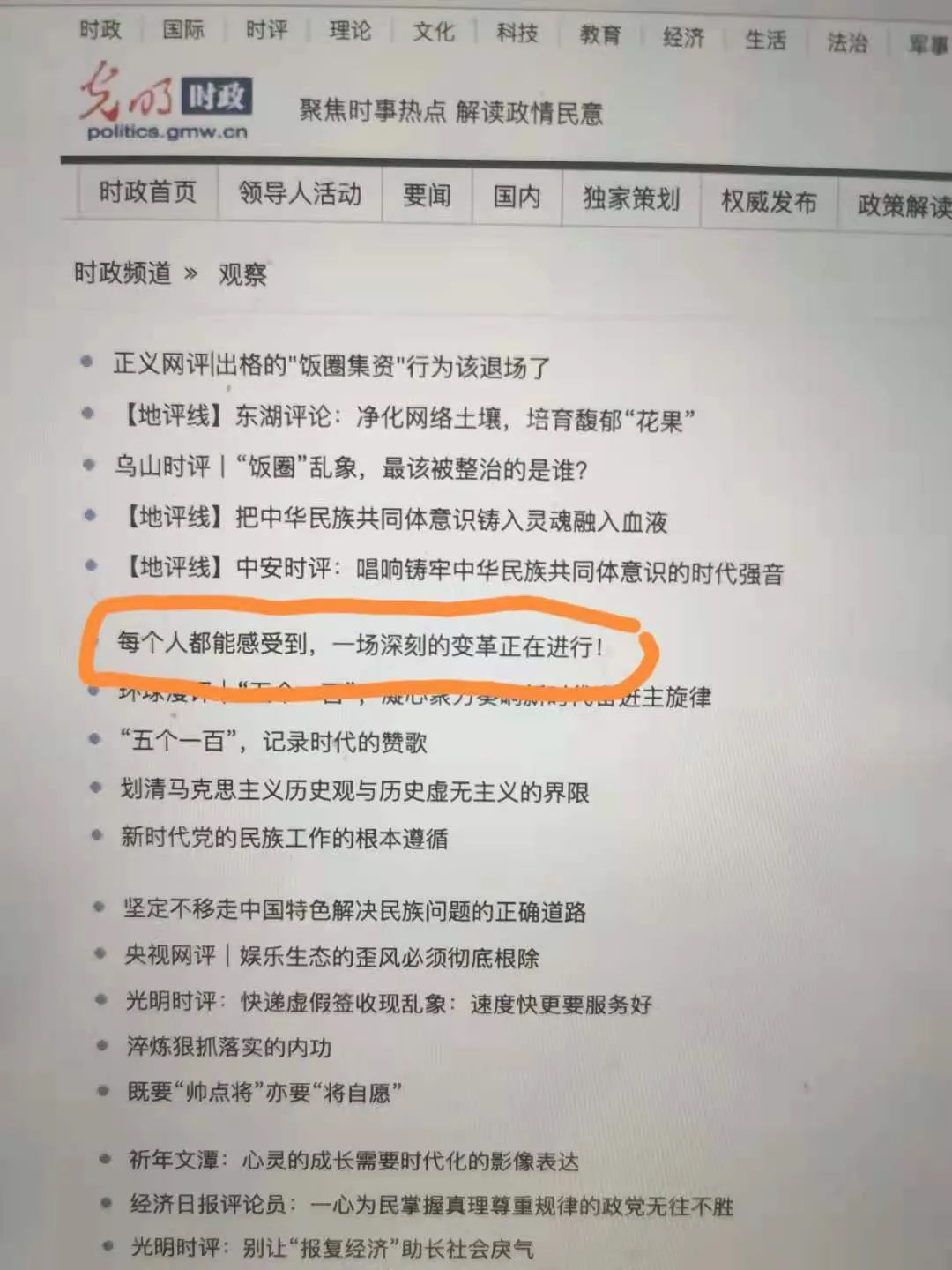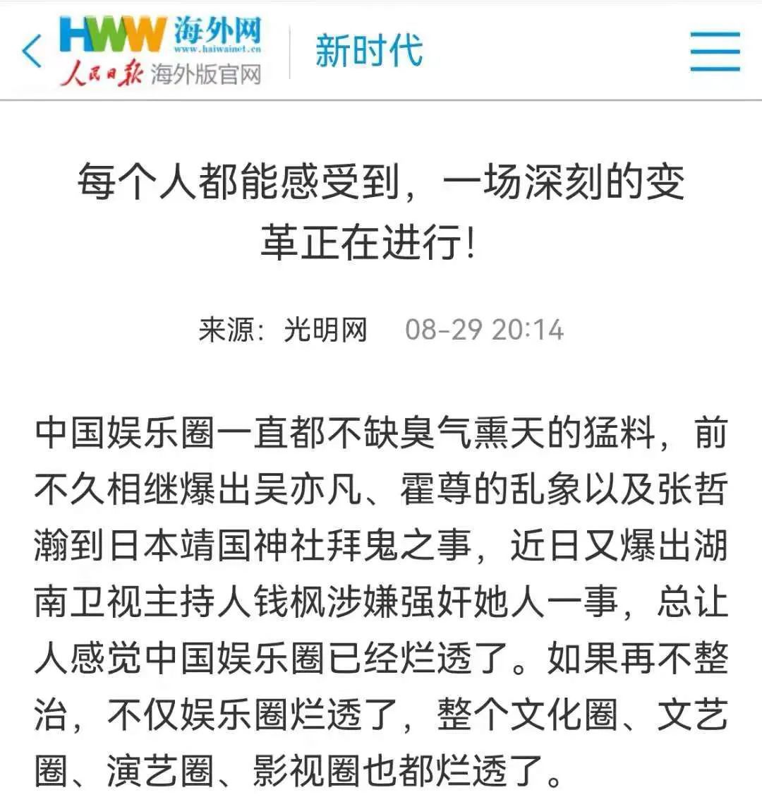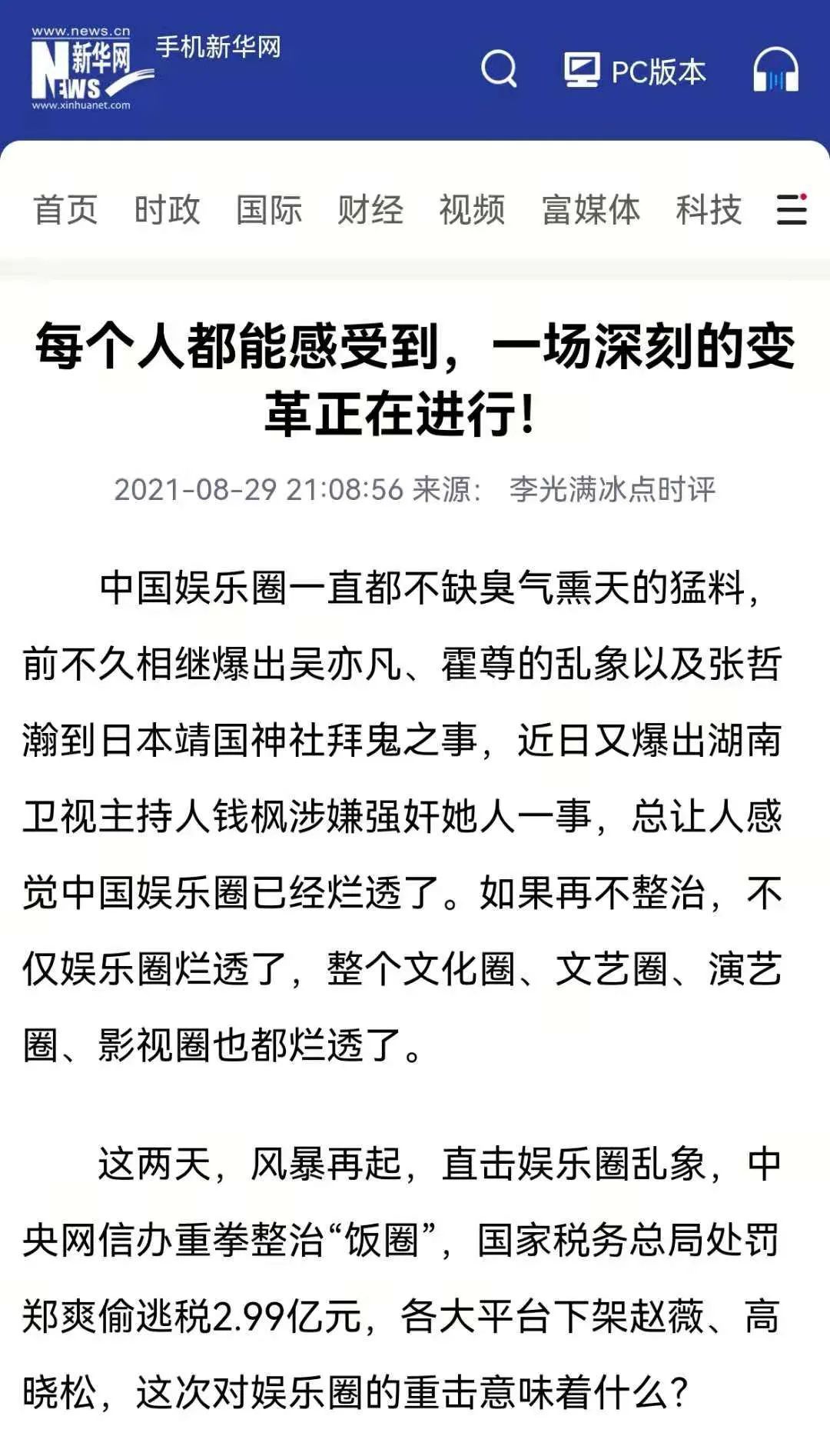 编者按:8月29日,包括新华网、人民网、央视网、光明网、中新网在内的多家官媒在头版重要位置转发了一篇名为《每个人都能感受到,一场深刻的变革正在进行!》的文章,该文来自微信公众号“李光满冰点时评”,内容为围绕中央网信办加强饭圈乱象重拳治理的行动点评“娱乐圈乱象”,其作者李光满认为“当前中国正在发生的这场深刻变革…..是为了应对美国已经开始对中国发动的野蛮而凶猛的攻击”,建议彻底整肃“资本圈、娱乐圈、文艺圈、影视圈”,希望变革“向着中国共产党的初心回归”。数十家官媒集中统一刊发来自公众号的文章——此举较为罕见,以至于作者李光满专门撰文记录这一重大时刻,并自称“这显然是新闻宣传主管部门和网信主管部门的统一安排,由此形成了非常强势的宣传效应。”