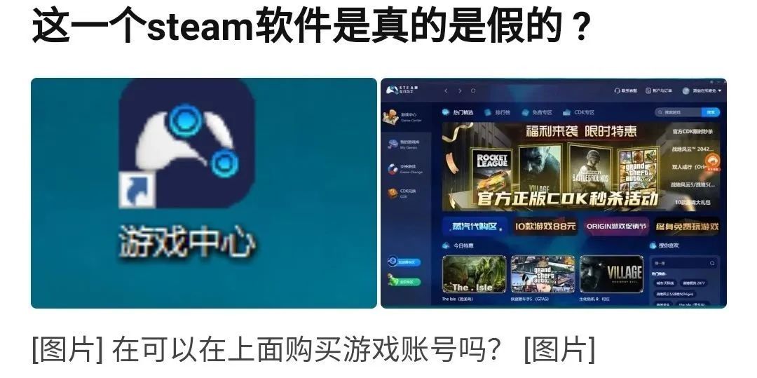 点进去一看,好家伙,放个图做对比。它和Steam正版网页的UI和配色几乎一模一样,就连正版网页有个不能显示图片的Bug也被完美还原,唯一不同是多了“游戏管家”这四个字。别说游戏小白,老玩家一不留神也很可能被忽悠。