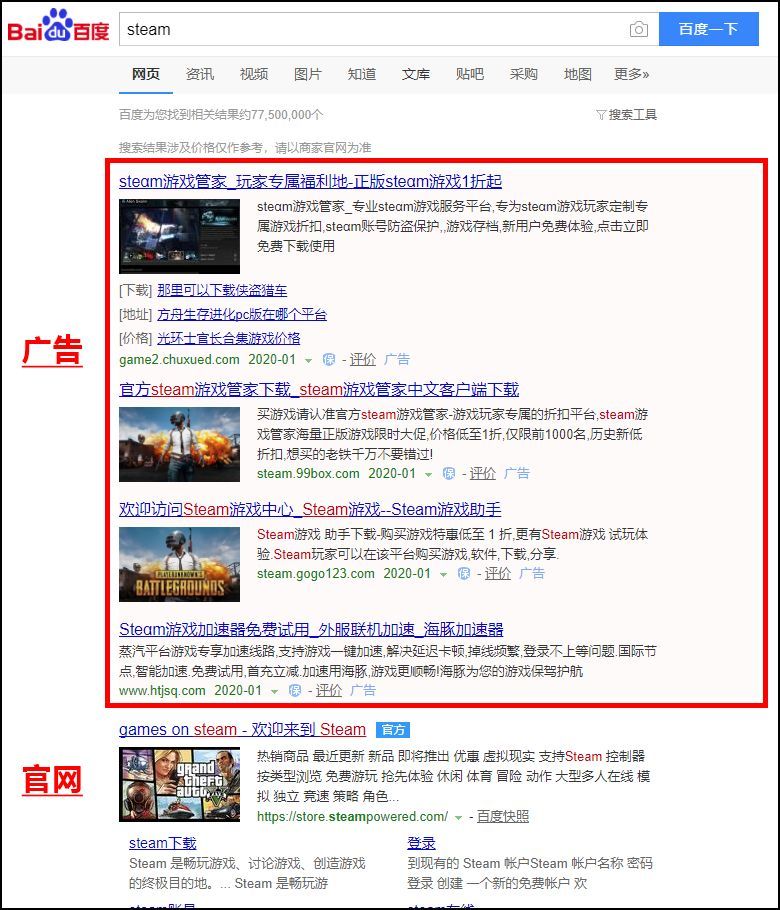 以最具代表性的百度为例。现在你直接在百度搜“Steam”不加任何词缀,排在前两位的倒也还是正版官网,似乎度子这人还算厚道,能处。