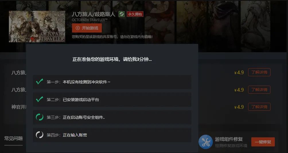 但别着急,接下来才是重点。点击开始游戏,它还会检测你的电脑里有没有Steam(真正的Steam)。如果没有,它会自动给你下载安装,然后启动Steam,在Steam里下载游戏,最后在Steam端打开运行。