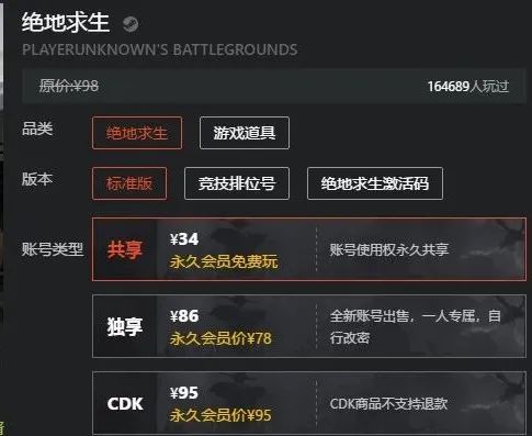 当然,它们是能买游戏的,却鸡贼地把购买选项分成“共享”、“独享”和“CDK”三种,分别对应和合租账号、单租账号、买激活码自己用。