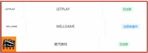 我顺着一些网站下的公司地址,找到了包括禄趣(上海)科技有限公司、武汉号号科技有限公司和武汉游侠互娱科技有限公司等一批企业名单。其中最离谱的是这个叫武汉号号的家伙,旗下申请的商标信息超过一百种,包括有已过审的“蒸汽游戏”、山寨Epic的“LETPLAY”和未能过审但明显是山寨WeGame 的“WELLGAME”等。