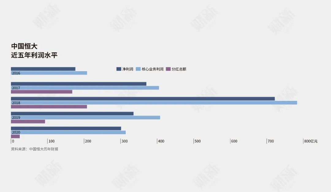 2019年恒大颓势显现,净利润从722.1亿元骤降到335亿元,有息负债约8000亿元,客户预 收款大幅降至1297亿元,手持现金1500亿元,不足以支付3721亿元一年内到期的债务。2020年净利润降至314亿元。2021年上半年,恒大地产和恒大童世界集团有限公司的房地产业务净亏损41亿元,新能源汽车业务净亏损49亿元,靠着出售资产才获得105亿元净利。