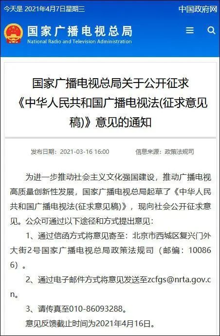 在今年的3月16日,国家广播电视总局官网发布了关于公开征求《中华人民共和国广播电视法(征求意见稿)》的通知。