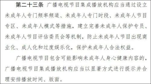 其中第二十三条提及“广播电视节目集成播放机构应当通过设立未成年人专门频率频道”,多名专家表示,立法中已在探索防止未成年人节目出现商业化、成人化和过度娱乐化现象的初步分级制度。