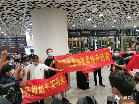 经中国政府不懈地努力,9月25日晚,华为公司财务总监孟晚舟乘坐中国政府的包机,从加拿大回到了中国广东省深圳市。当晚,有华为员工与网民在深圳机场打着横幅迎接孟晚舟回国。