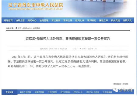 2021年8月11日,辽宁省丹东市中级法院依法对迈克尔·斯帕弗为境外刺探、非法提供国家秘密一案公开宣判,认定迈克尔·斯帕弗犯为境外刺探、非法提供国家秘密罪,判处有期徒刑十一年,并处没收个人财产人民币五万元,驱逐出境。
