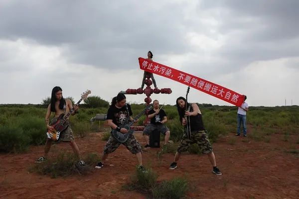 为了给受污染影响的村民“代言”,坚果找来了职业摇滚乐队,在受污土地上搞重金属演出。他把用9000瓶用农夫山泉纯净水和村民换来的超标地下水,运到了北京798艺术区做的一场名为 “‘农夫山泉’有点锰” 的展出,是当时环保圈热议的新闻。这个项目在后续引发的一系列社会关注中,推动了榆林市从环保局到生态环境部接连做出回应,承诺做出治理改变。