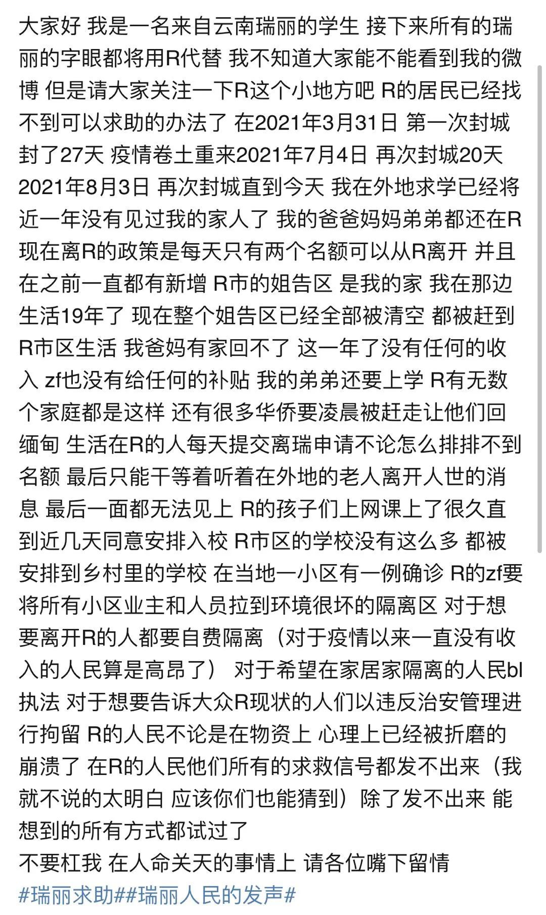 10月26日,一名自称“瑞丽学生”的网友发帖,哭诉他全家一年没有任何收入,已经在崩溃的边缘。