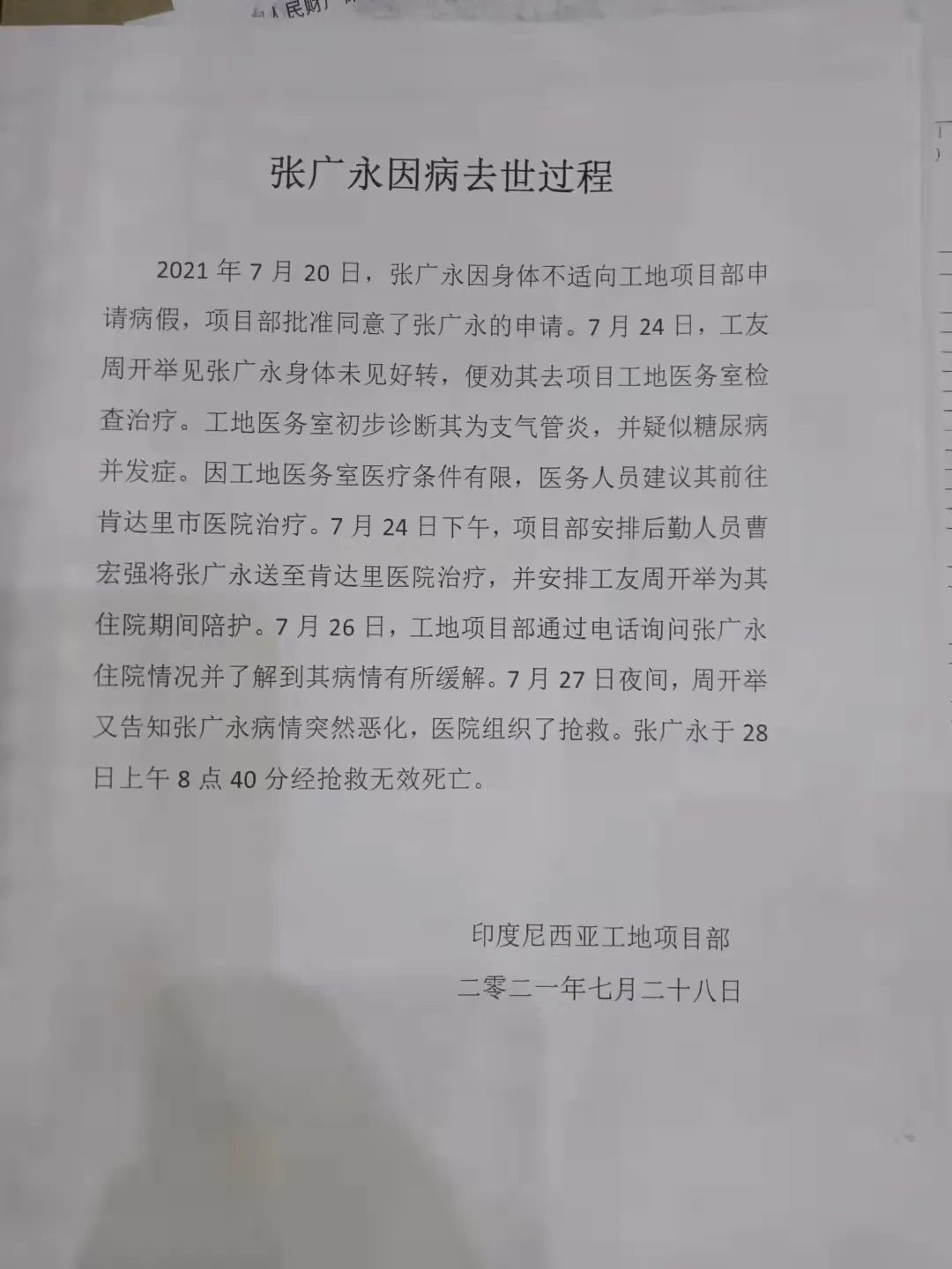 当地项目部出示的“张广永因病去世过程”说明书上写着:7月20日,张广永因身体不适请病假;24日,工地医务室初步诊断其为支气管炎,并疑似糖尿病并发症,后在医务人员建议下前往肯达里市医院治疗;28日,抢救无效身亡。