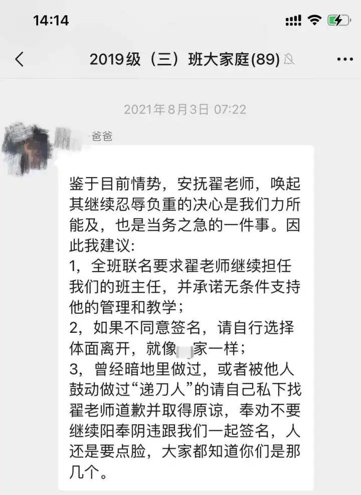 那天,恰好也有家委会的一个成员待在校园里,我一下子明白了很多事情。我觉得在整个过程中,家委会似乎就充当了翟老师代理人的角色,并且还在裹挟和绑架其他家长。