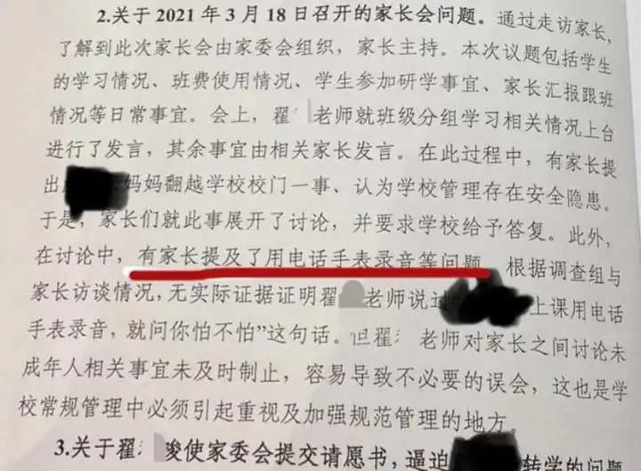 2021年6月,贵州观山湖区教育局出具《信访事项再处理意见书》:翟老师作为班主任没有及时制止并默许新建的微信群存在,同时在该群发布一些有关班级事宜的通知,并在群中和其他家长讨论与妞妞家相关问题,行为确存在不当之处。调查没有发现翟老师唆使家委会或家长签联名信,但翟老师没有及时查明联名信内容并制止该行为,行为确存不当之处。