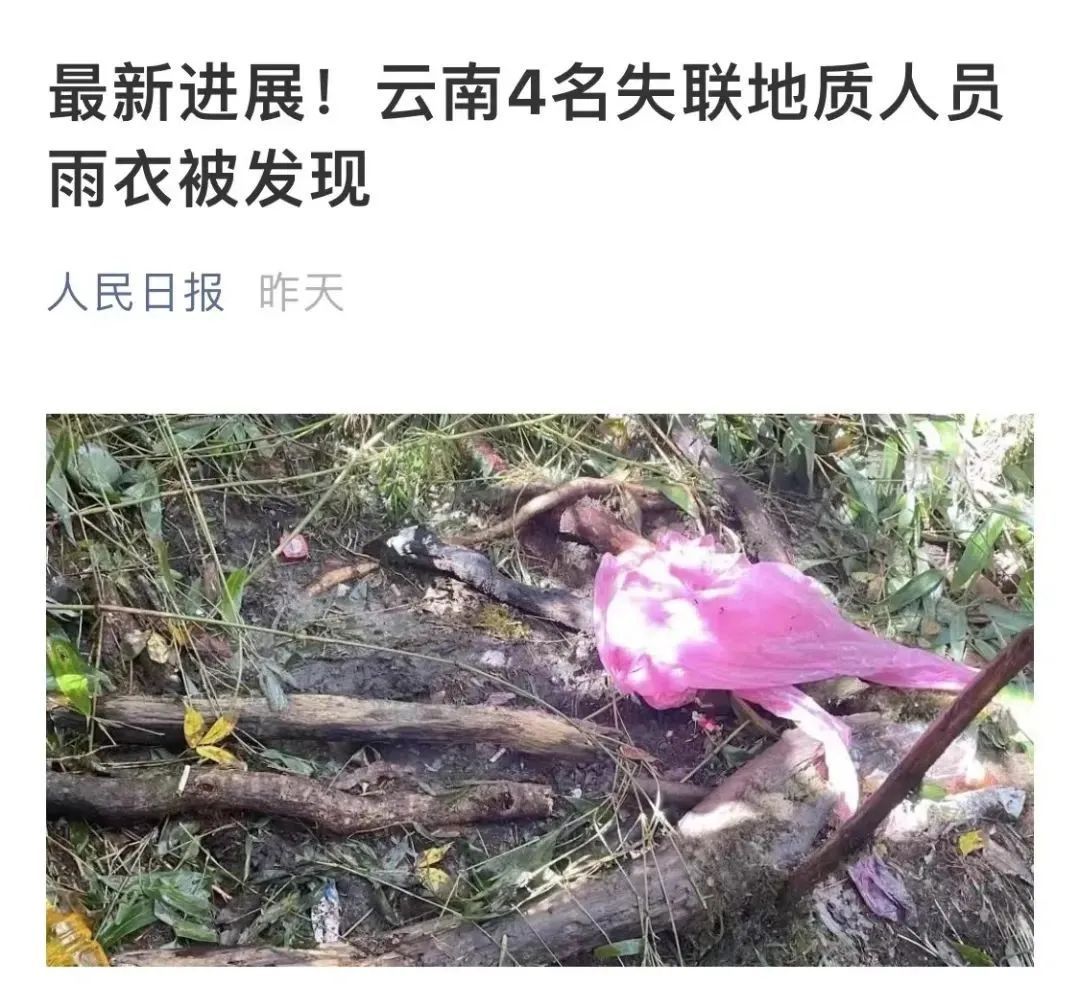 要不是人民日报发的配图说是失联人员的雨衣,我还以为这是谁丢在山里的塑料垃圾袋……