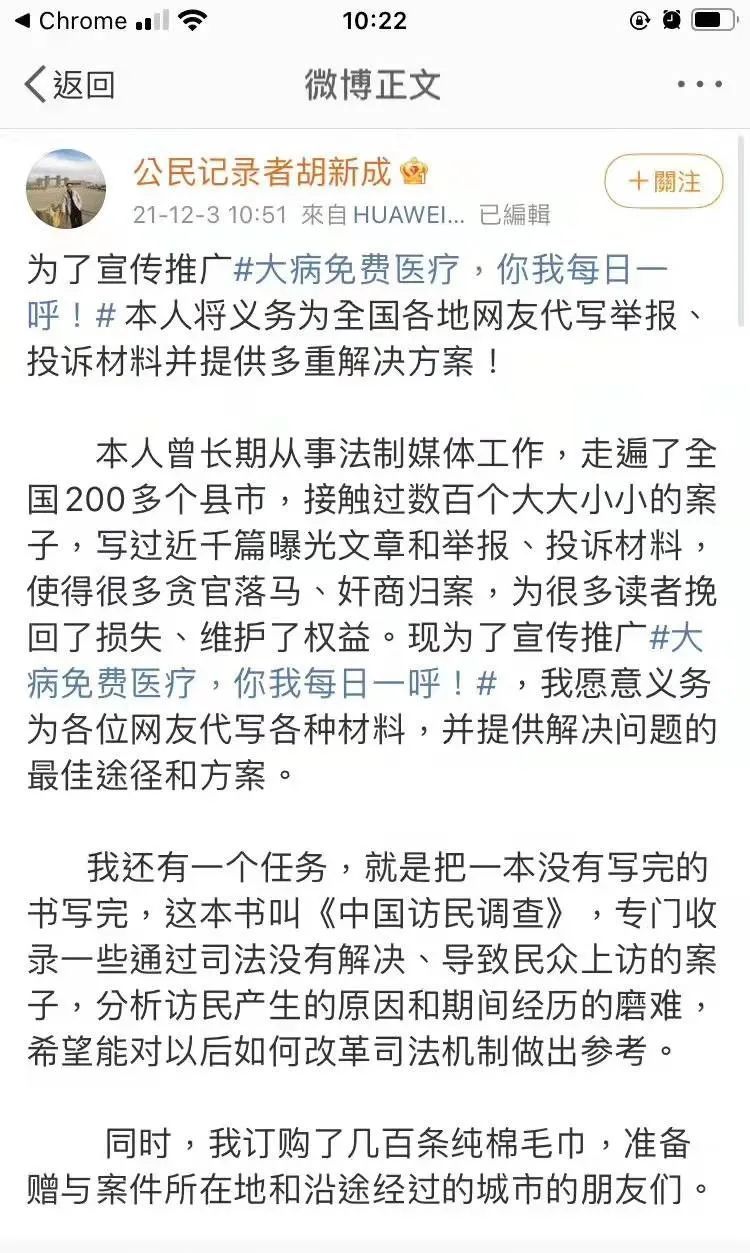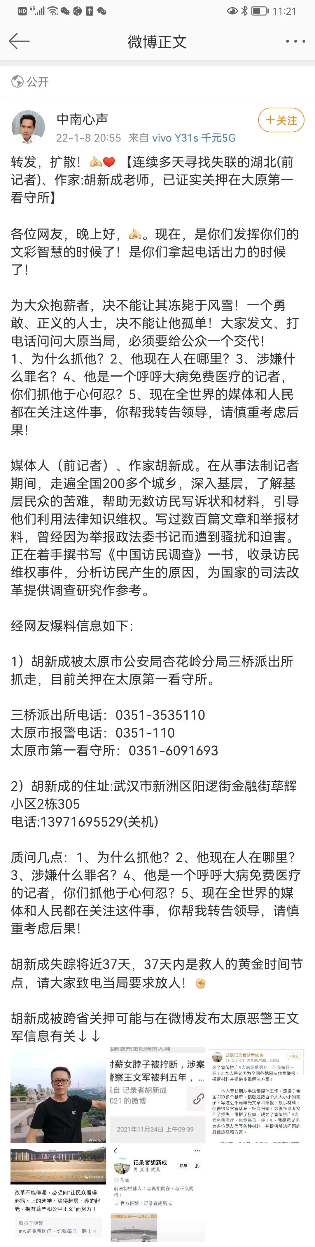 相关阅读:维权网|湖北武汉媒体人、记者、作家、“大病免费医疗 你我每日一呼”运动推广人胡新成遭强迫失踪36天
