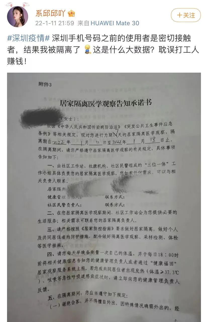 这名网友说,她有一个深圳手机号码,因为该号码之前的使用者是密切接触者,结果导致她也被强制居家隔离,这让她很无助。
