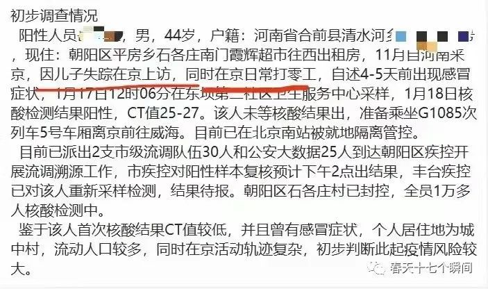 昨天,1月18日下午,北京疫情防控发布会公布了最近的第二个新冠阳性病例。说他现住朝阳区平房乡石各庄村558号,2021年11月来京务工。1月14日左右出现感冒症状,1月17日前往朝阳区核酸检测点进行核酸检测,1月18日早晨反馈核酸检测结果异常,14:00经市疾控中心实验室复核结果为阳性,并检测出德尔塔变异株特异性突变位点阳性。