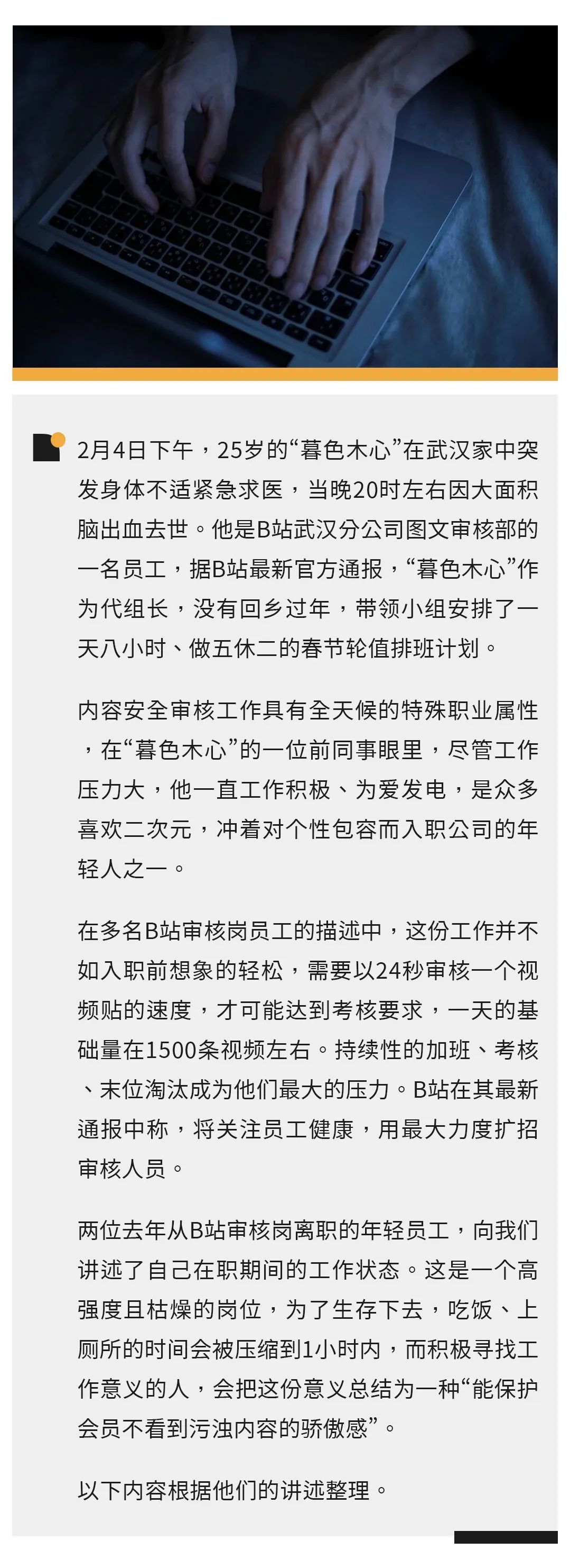 看到武汉审核员的新闻,我觉得他应该是一个很有责任感的人,有点心疼他。我问了还留在B站的同事,现在制度也没什么变化。有人觉得自己不该因为这件事离职,留下来还是可以做到一些什么,希望B站更在乎审核人员一些。
