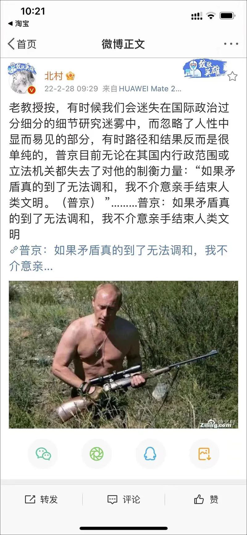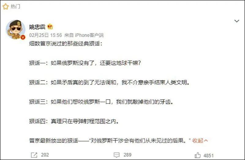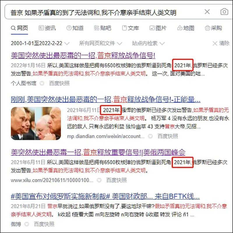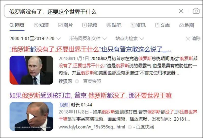 俄罗斯对乌克兰开战后,微博、抖音、知乎等简体中文社交网络广泛流传说法称,普京曾经放狠话,“如果矛盾真的到了无法调和,我不介意亲手结束人类文明”,还表示“俄罗斯没有了,还要这个世界干什么”。