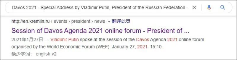 使用“putin ‘human civilization’ ”作为关键词在搜索引擎检索可以发现,普京的确在2021年的达沃斯论坛上发表过涉及到“人类文明”(human civilization)的讲话,但是具体内容并非流传信息所表达的含义,而是在新冠大流行和出现“国际冲突”(global conflict)的背景下发表的讲话。