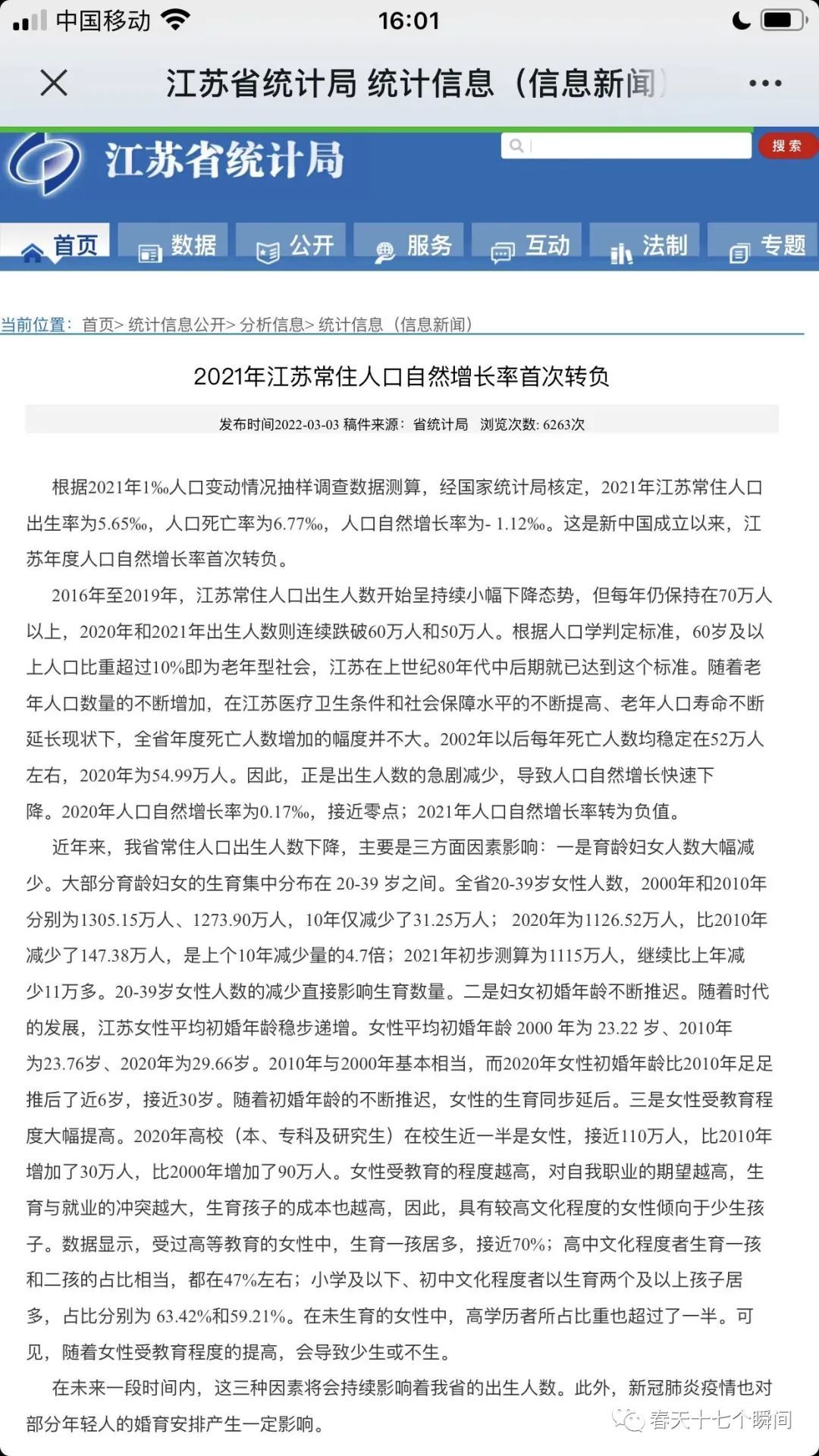 “这是新中国成立以来,江苏年度人口自然增长率首次转负。”