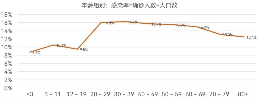 值得注意的是,Omicron对各年龄段无差别打击。在各个年龄段中,感染率(该年龄段感染人数÷该年龄段的人口数)在 8%-16%之间,差别非常细微,这与早期“新冠病毒主要攻击老年人”的特点非常不同。20岁到60岁的中年人,感染率甚至比小孩和老人还略高一些,这跟他们的社交范围有关。