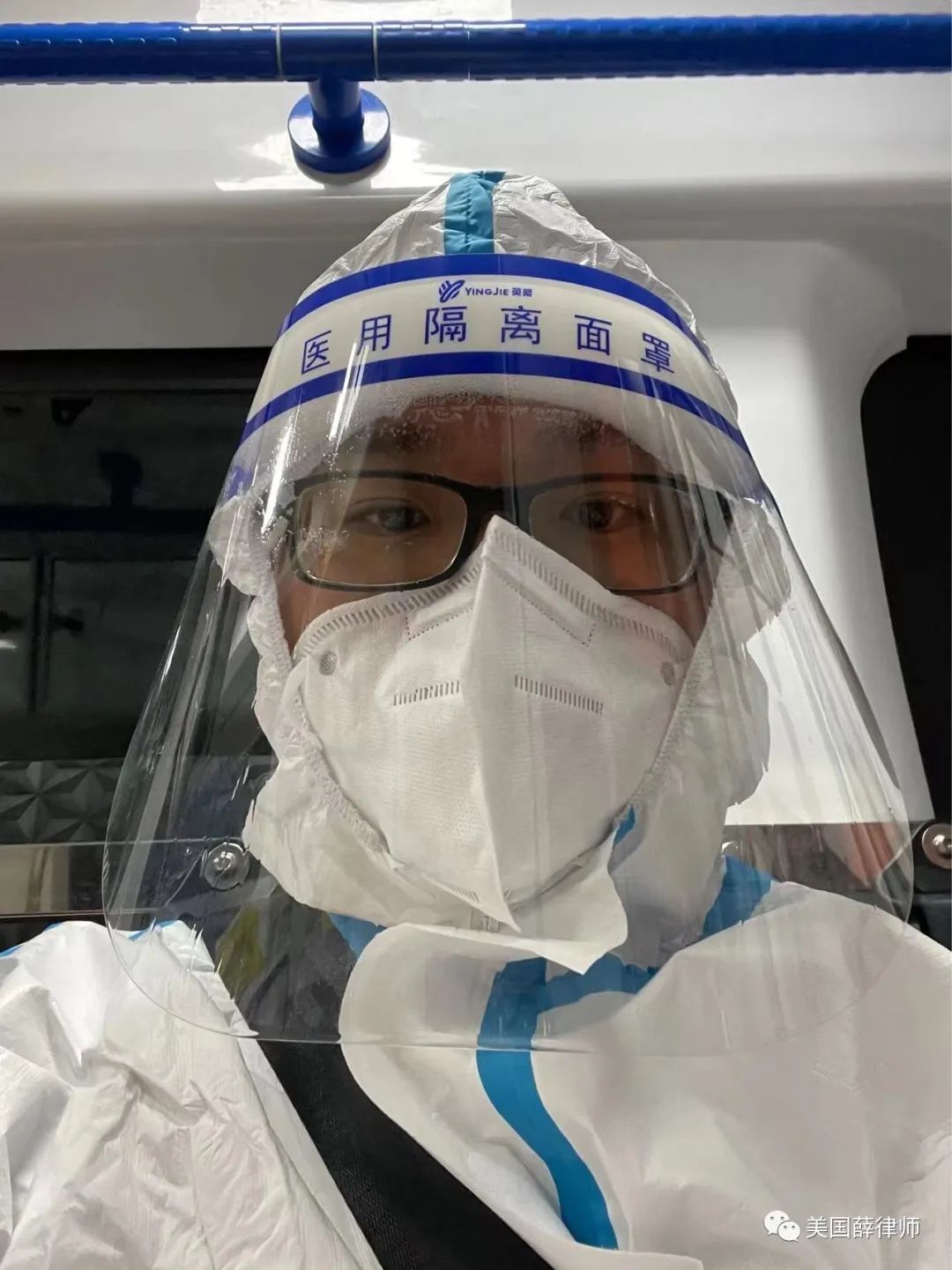 但是当我洗好澡,吃了晚饭,正要躺下休息的时候,一通电话改变了所有的一切。我被通知在机场的核酸检测是阳性,会在当晚被转移至医院确诊。也就是说现在的检测是阳性,但还要去医院确诊后才行。被告知会送一套防护服过来,等一下有人接我去医院,是120的急救车,要带好N95口罩和防护面罩。等到大约晚上11点左右,才通知我下楼去医院。我从未穿过防护服,整个装备上身后,感觉透不过起来,我本人又要戴个眼镜,所以会有雾气,只看到防护面罩上的水珠不断流下来。我坐在急救车里面,再一次感觉恍如隔世。