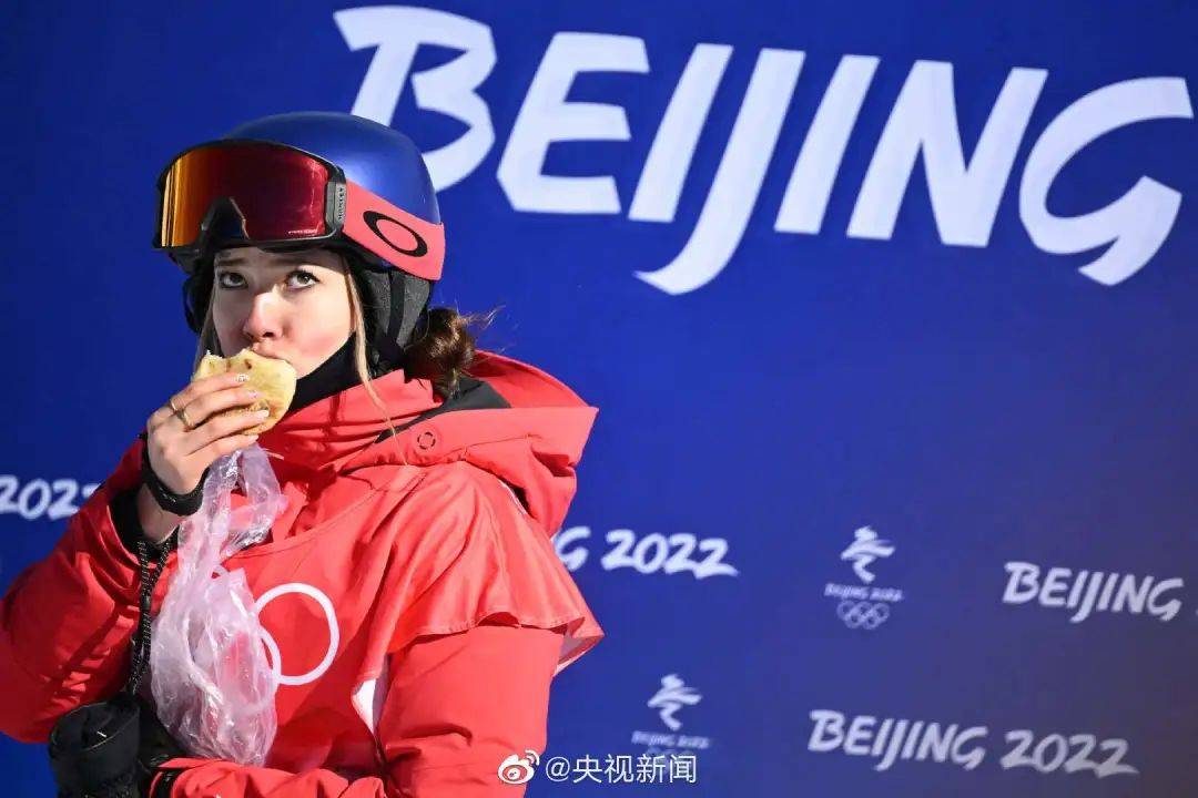 她在自由式滑雪女子坡面障碍技巧资格赛上等分数时拿出的韭菜盒子,一下子吸引了世界的目光,同时,她这份自信和从容也感染着屏幕前的观众。