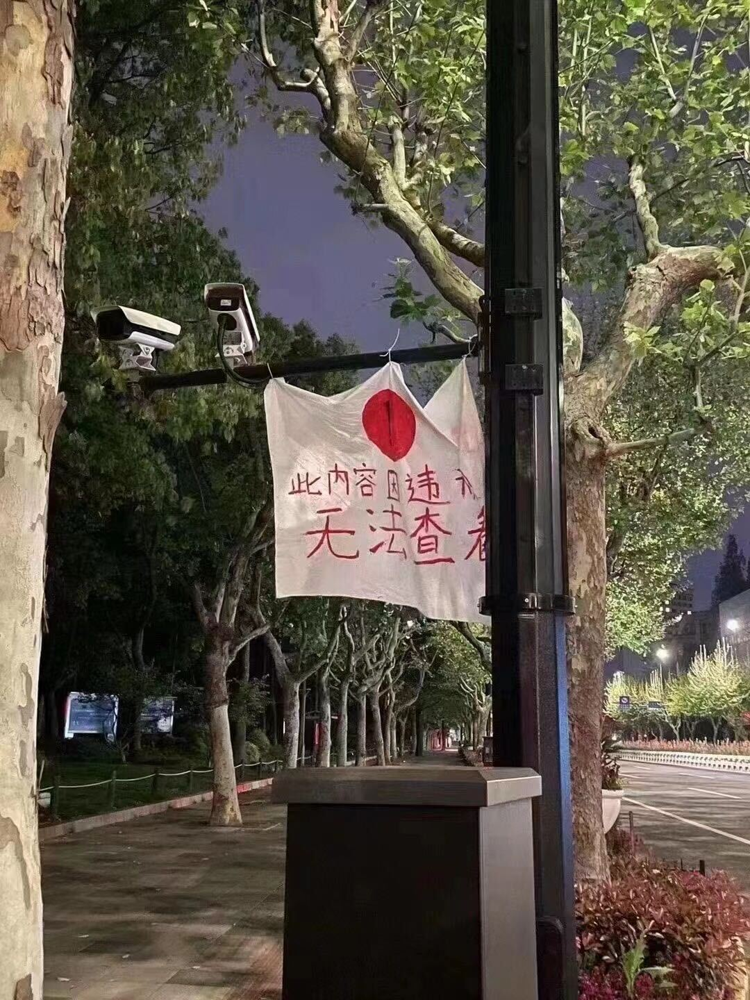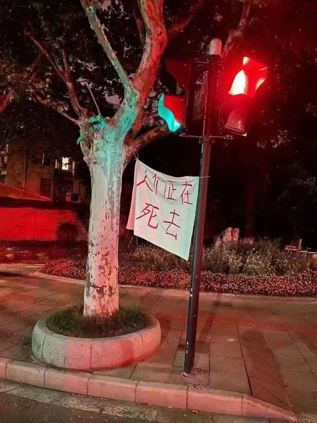4月18日凌晨,一位不知名的市民在上海的街道上悬挂白布红字的一系列标语,表达抗议。