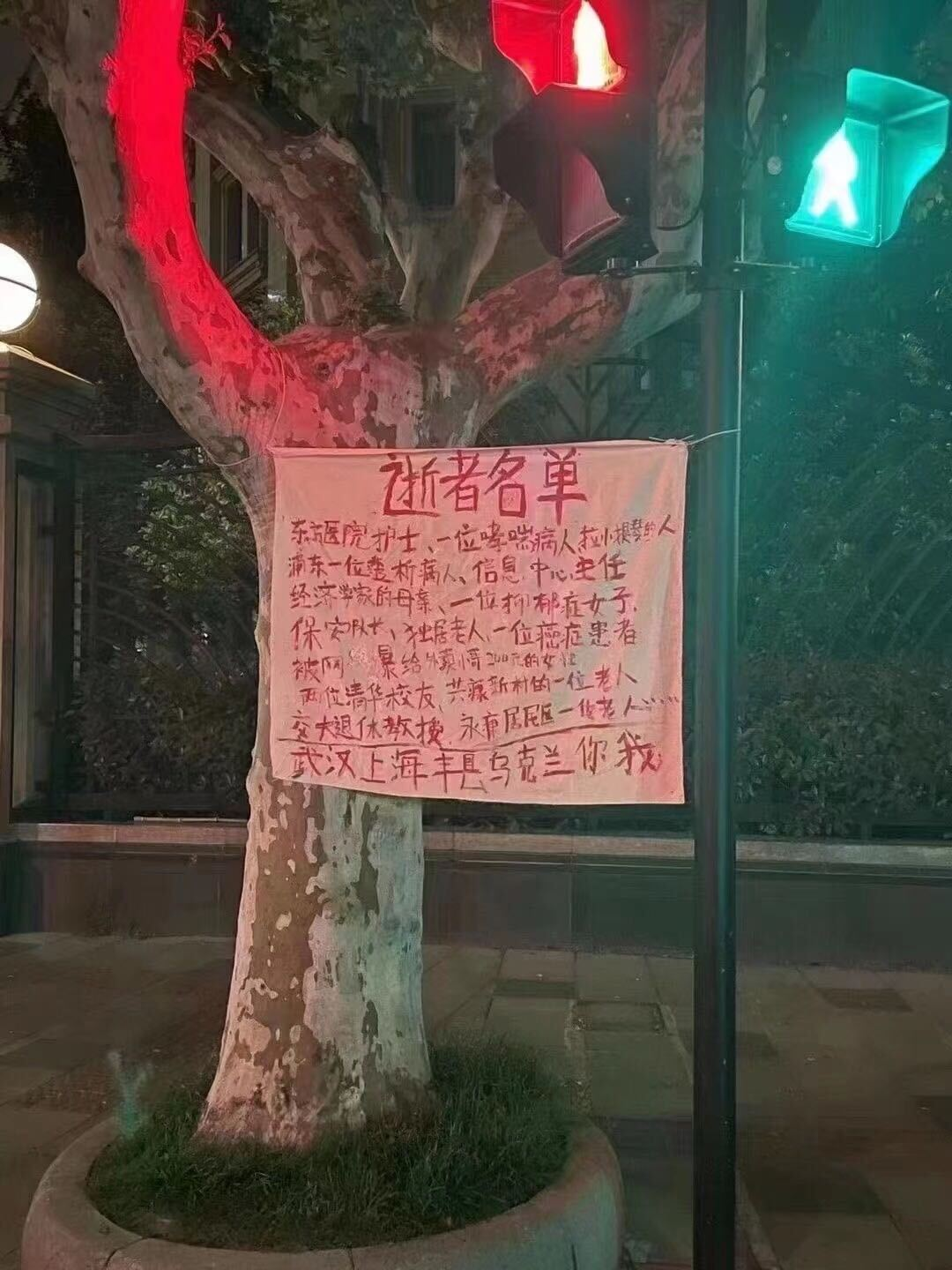 一条标语写道“人们正在死去”;另一条写着“反对无限制封城”;还有一条上面画着一个红色的感叹号,下有文字“此内容因违规无法查看”。这一画面出自微信公众号文章被删除的页面显示。最后一条标语写上了在封城次生灾害中遇难的死者的部分名字,最后一行写着:“武汉、上海、丰县、乌克兰、你、我”。