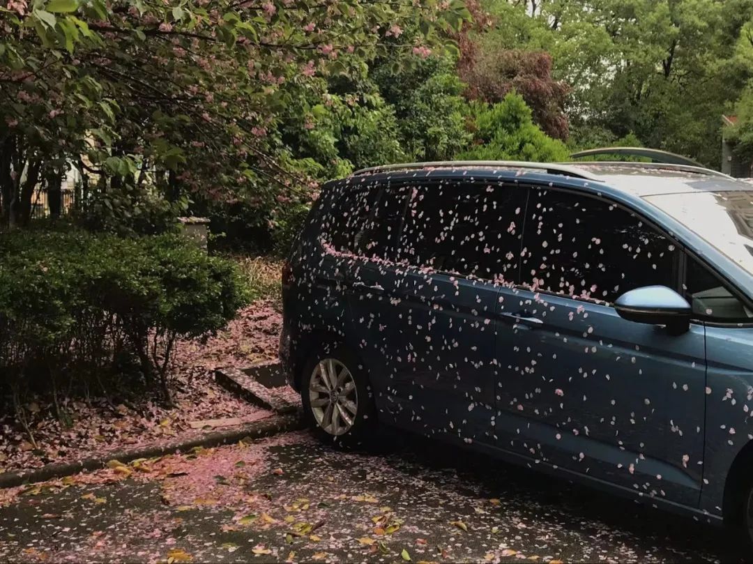 昨夜下了一场大雨,清早虽然雨停了,但春风多厉,香樟树冠间也不断有零雨滴落。一棵樱花树的花瓣洒满了底下私家车的车身,不少人在排队的间隙停下来拍照。