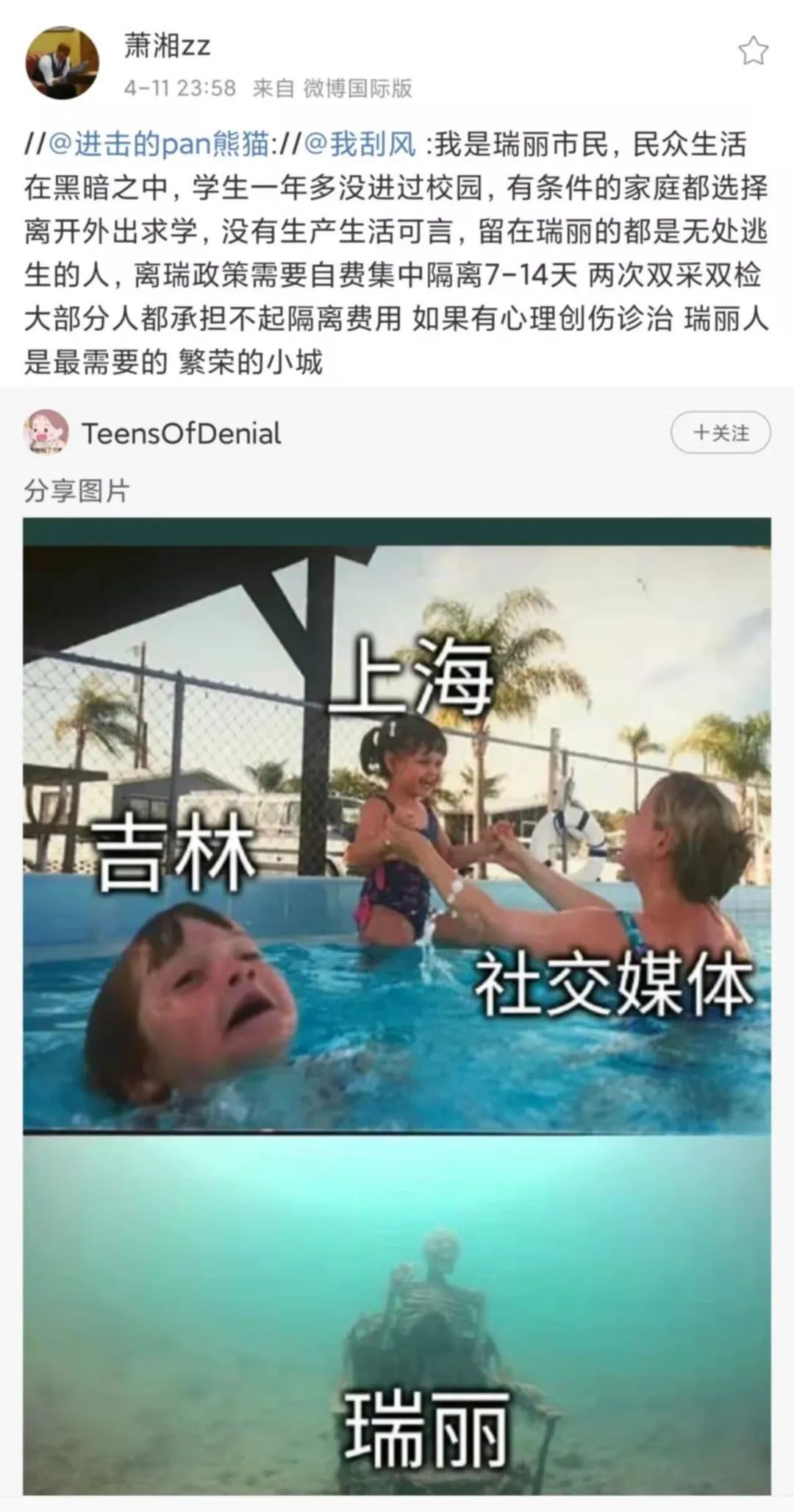 微博上有人转发了这篇,在底下留言里,我看到有人讥讽说,这不过是上海人在“围魏救赵”,凸显“小地方”的悲惨来比烂,以显示上海没那么差。这真是一种令人震惊的狭隘,他们眼里看到的不是具体的人所正在遭受的痛苦,而斤斤于身份的高下。