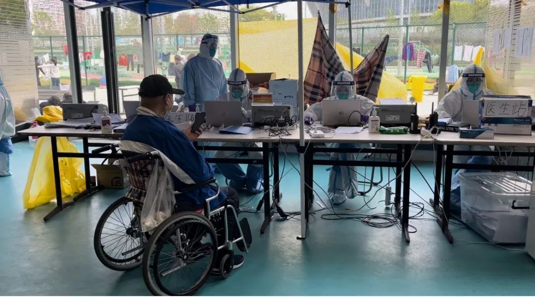 事情是这样子,那是一个大概七八十岁的老人。他是中风了,腿脚不方便。中风了之后还被运到这边来,就坐着轮椅。我那一天早上拍到,他推着轮椅去跟那个方舱里的护士站讲话,但我没有听到他具体讲什么,后来想到他可能就是在反馈洗手间的问题。