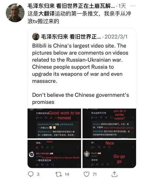 @maozedongguilai是 “大翻译运动”的另一位积极参与者。有线索表明,他甚至可能是这场“大翻译运动”的早期发起者。3月30日,@maozedongguilai转推了一则其本人发布于3月1日的推文,内容显示为一组对哔哩哔哩视频网站评论区留言的翻译图片。@maozedongguilai称,这是“大翻译运动的第一条推文”,是其“亲手从冲浪tv搬过来的”。