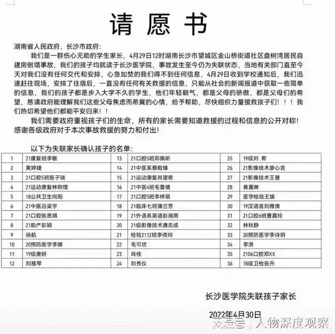 这是灾祸发生的第二天(4月30号)一群失联大学生的家长们联合签订的,恳请当地ZF赶紧组织救援: