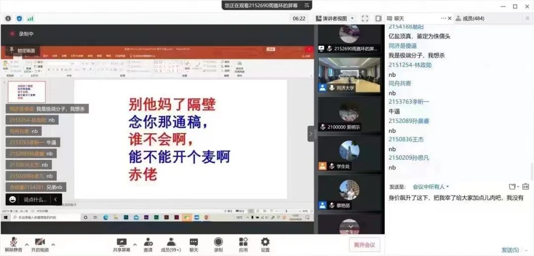 有位学生因为不满自己被闭麦,将自己的抗议投屏到会议界面上。于是参会者都看到红蓝相间的字体写着:“别他妈了隔壁念你那通稿,谁不会啊,能不能开个麦啊,赤佬”。“赤佬”是吴语区的脏话。