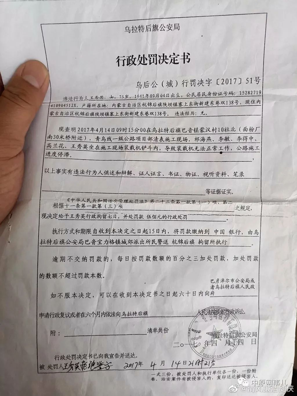 2017年4月14日,乌拉特后旗政府再次动用公安,将蒙汉十社的村民祁海燕、李敏、李得中、高兰花、王秀英(女,75岁)拘留七天,并各处罚款500元。